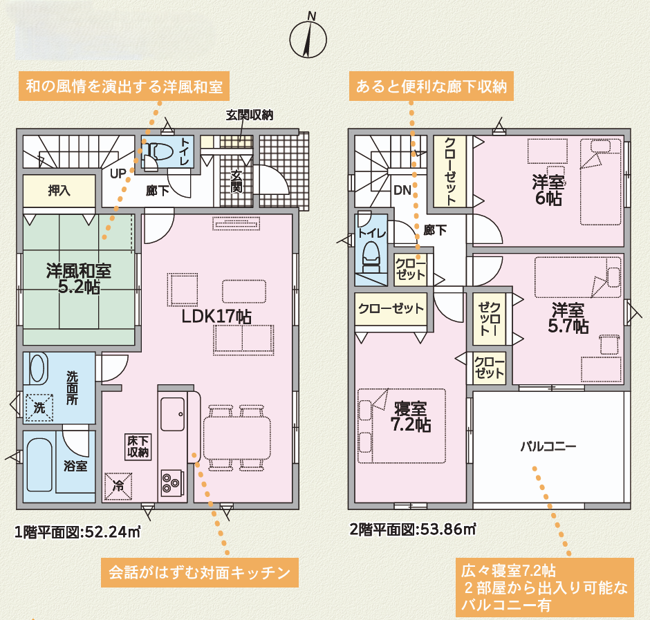 ●家族がくつろげるLDK広々17帖+洋風和室5.2帖!